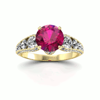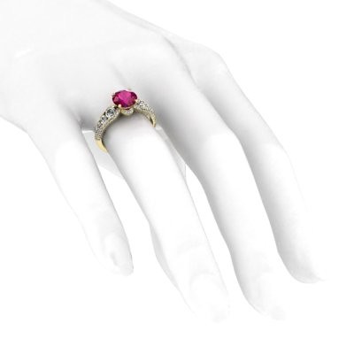 Połączenie żółtego złota z kamieniem szlachetnym o nazwie rubin stało się już klasyką. Jednak ten pierścionek jest trochę inny. Dodatkowo znajduje się w nim aż 68 brylantów. Rubin jest tutaj kamieniem głównym. Znajduje się w koronie pierścionka i ma masę 1,79 ct. Dodatkowo w szynie pierścionka umieszczono diamenty o łącznej masie 0,98 ct. Dwa największe brylanty posiadają łączną masę 0,36 ct, a dwa najmniejsze mają łączną masę 0,10 c. Pierścionek jest odpowiednią biżuterię na większe wyjścia, ponieważ prezentuje się wyjątkowo elegancko.