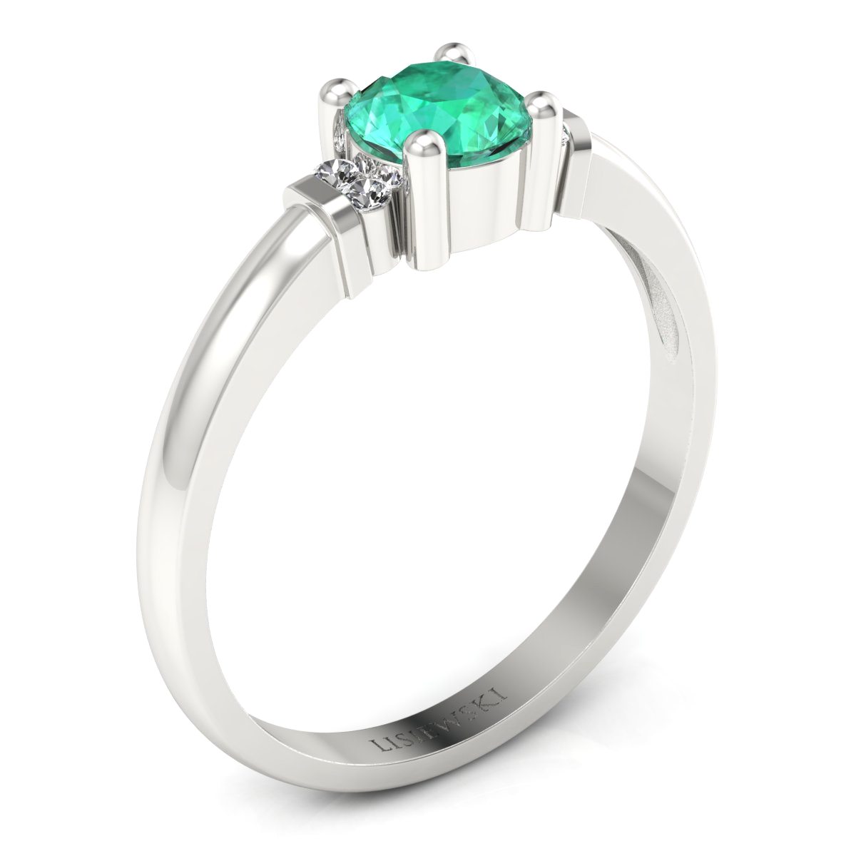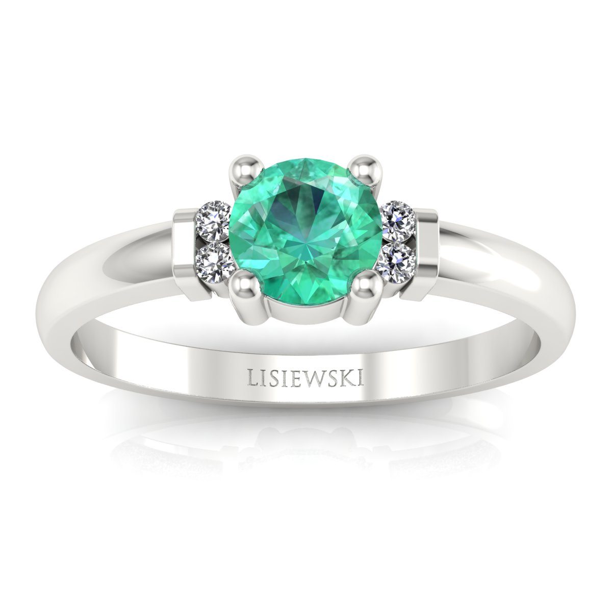 Zaskocz swoją ukochaną i podaruj jej ten wspaniały pierścionek zaręczynowy. Jest to nowoczesny wzór pierścionka, w którym króluje kamień centralny - szmaragd. Nie jest on osamotniony w swoim blasku, towarzyszą mu 4 mniejsze diamenty, które dzięki swojej oprawie zaraz obok kamienia centralnego, zwiększają jego blask. Korona pierścionka w tym wypadku jest nowoczesną oprawą, a szyna pierścionka nie należy do najcieńszych.