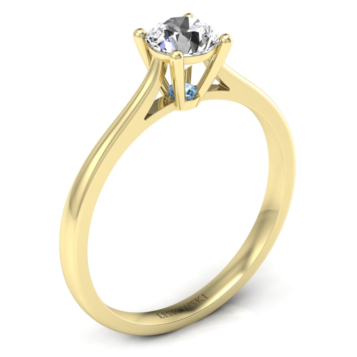 Jeżeli Twoja ukochana lubi pierścionki z żółtego złota, to z pewnością ucieszy się, gdy podarujesz jej pierścionek zaręczynowy z tego kruszcu. Poza żółtym złotem w pierścionku znajdują się oczywiście kamienie. Zostały one umieszczone w koronie. Pierwszy z nich to diament o masie 0,51 ct. Natomiast drugi jest bardziej nietypowy. Jest to topaz o masie 0,025 ct oraz przecudownym, brylantowym szlifie. Topaz charakteryzuje się wspaniałym jasnoniebieskim kolorem. Jest mniej widoczny w pierścionku niż brylant.