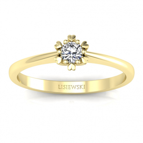 To niezwykle oryginalny złoty pierścionek z brylantem. Został wykonany z żółtego złota o próbie 585. W jego koronie znajduje się brylant o masie 0.10 ct i czystości Si1. Brylant jest otoczony przez oprawę z żółtego złota w kształcie serduszek. Mimo połączenia złota i brylantu, całość prezentuje się niezwykle dziewczęco i lekko. Jest doskonały do noszenia zarówno na wieczór, jak i na co dzień. Pierścionek z żółtego złota z brylantem można kupić również w komplecie z kolczykami oraz pierścionkiem.