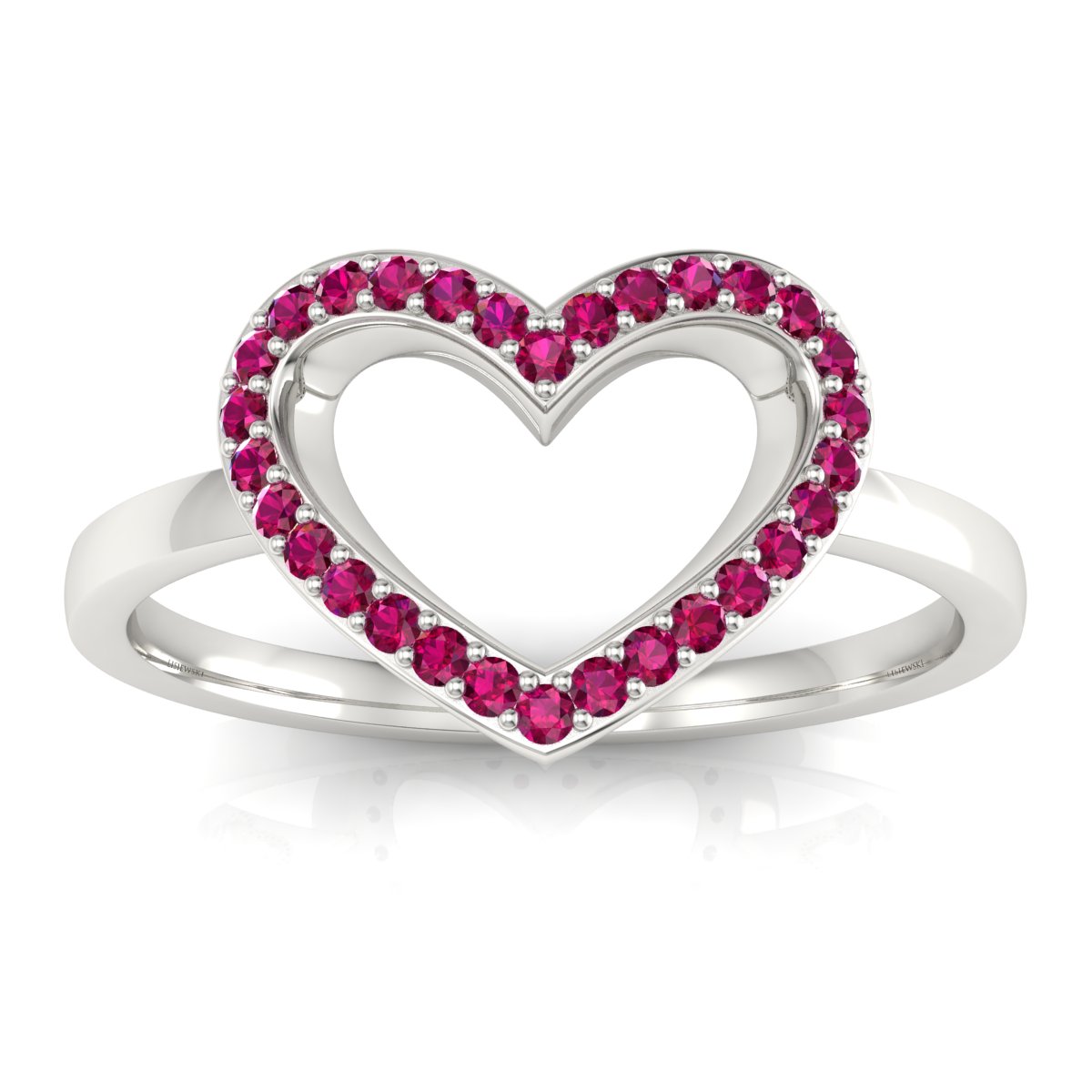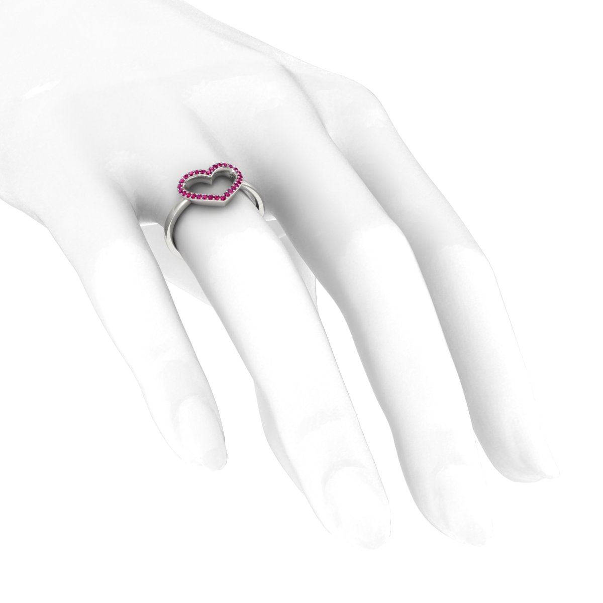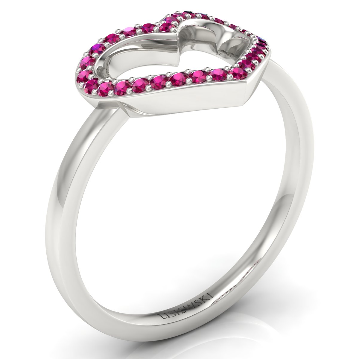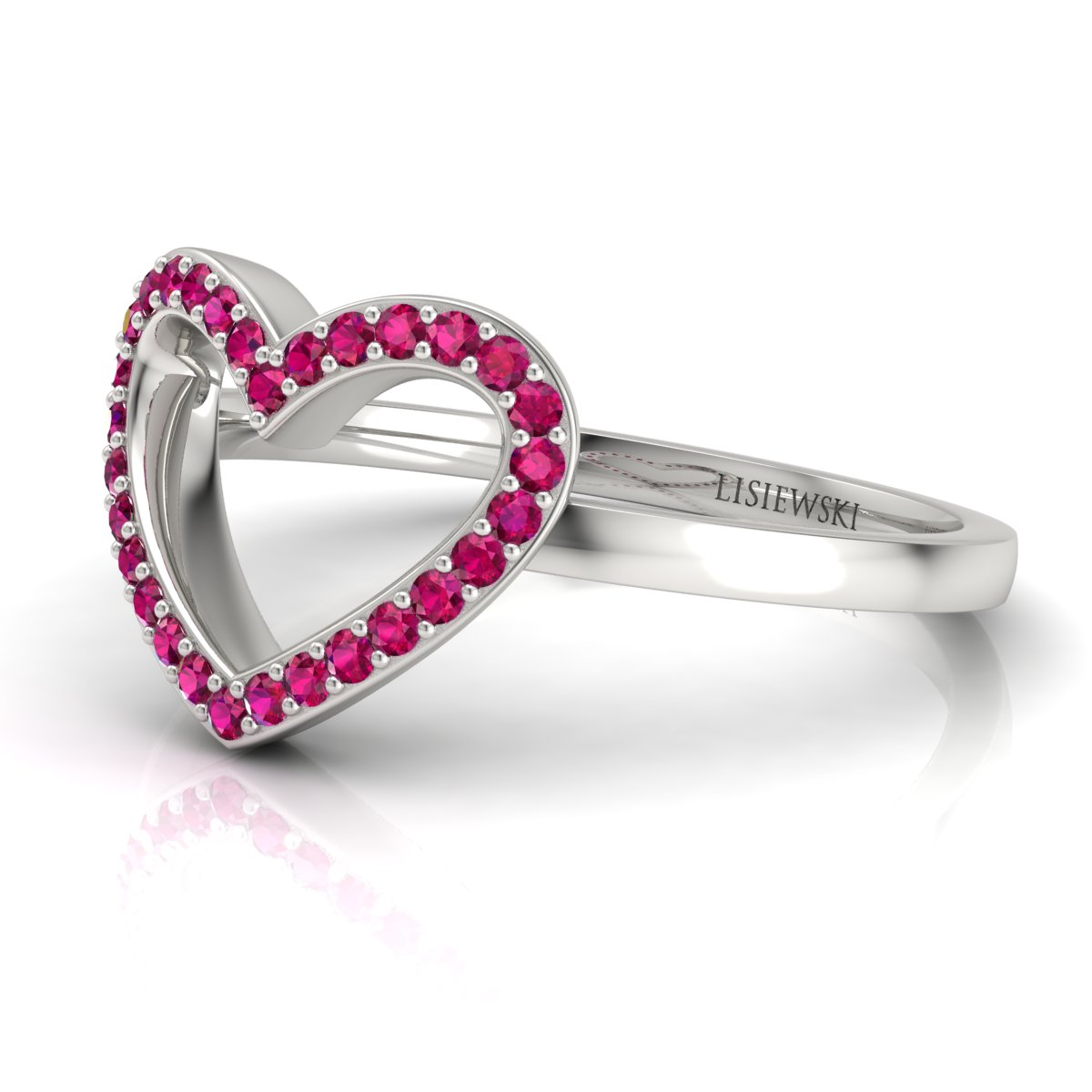 Pierścionek zaręczynowy, serce z rubinami, białe złoto