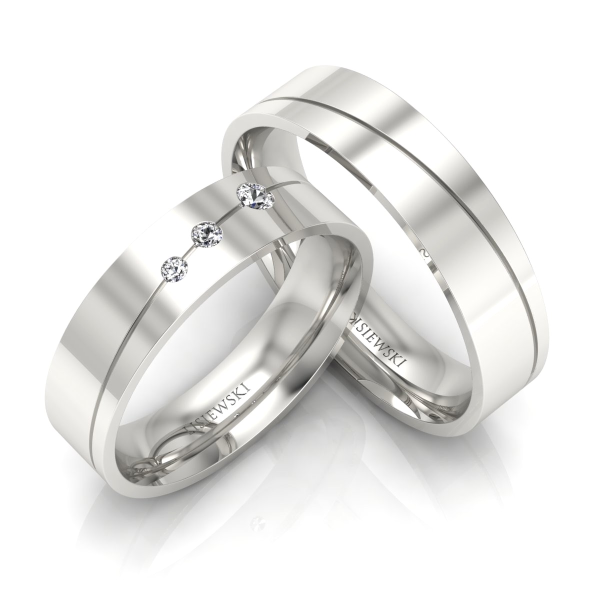 Platyna jest często używana do tworzenia z niej przepięknych obrączek. Wynika to stąd, że jest to metal, który nie uczula nawet bardzo wrażliwej skóry. W tych obrączkach platyna została połączona z zachwycającymi brylantami. Przez całą szerokość każdej z obrączek biegnie wygrawerowana linia. To sprawia, że obrączki wyglądają niezwykle interesująco. W obrączkach znajdują się po trzy brylanty. Zostały uszeregowane od najmniejszego do największego. Obrączki prezentują się bardzo elegancko i stylowo, a jednocześnie są skromne. Przypadną do gustu zarówno kobietom, jak i mężczyznom.