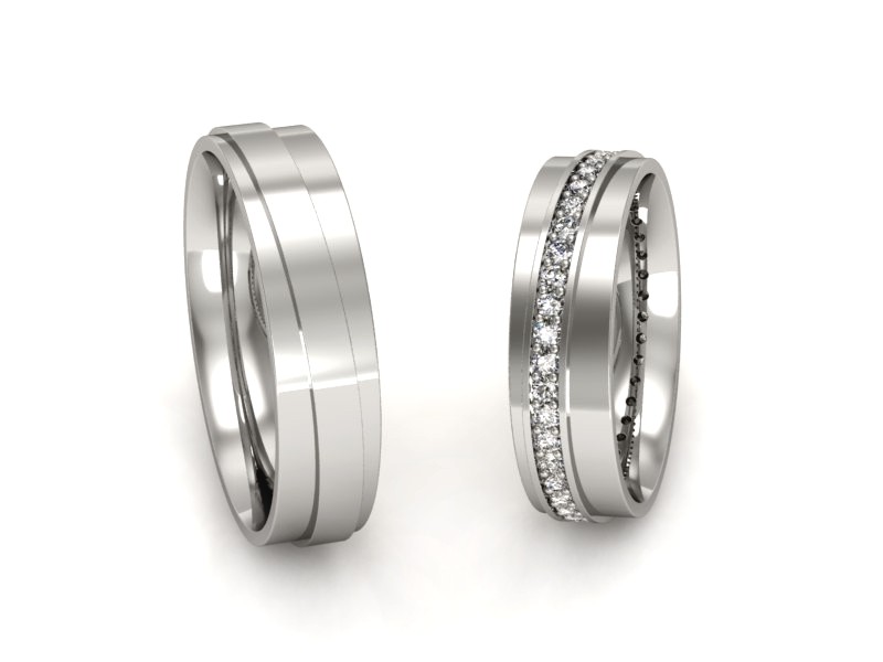 Platyna jest bardzo wytrzymałym metalem szlachetnym. Można powiedzieć, że jest ponadczasowa. Co ważne, ze względu na brak niklu w swoim stopie, nie uczuli nawet bardzo wrażliwej skóry. Powiedzieć, że wybór obrączek ślubnych z platyny to dobry wybór, to powiedzieć trochę za mało. Platynowe obrączki to wybór bardzo dobry i gdy po latach będziecie oglądać swoje dłonie przyozdobione w ślubne pamiątki, dalej będziecie zachwycać się blaskiem i pięknem biżuterii. Model przedstawiony w tym przypadku jest nowoczesnym wyborem dla osób, które lubią się wyróżniać. Diamenty oprawione wewnątrz wystającego ponad powierzchnie kanału sprawiają wrażenie większej ilości niż jest w rzeczywistości. Odbiciem obrączki damskiej, jest obrączka męska. W jej przypadku podwyższenie również jest, ale bez diamentów w nim oprawionych. Ciekawy i nowoczesny wybór.