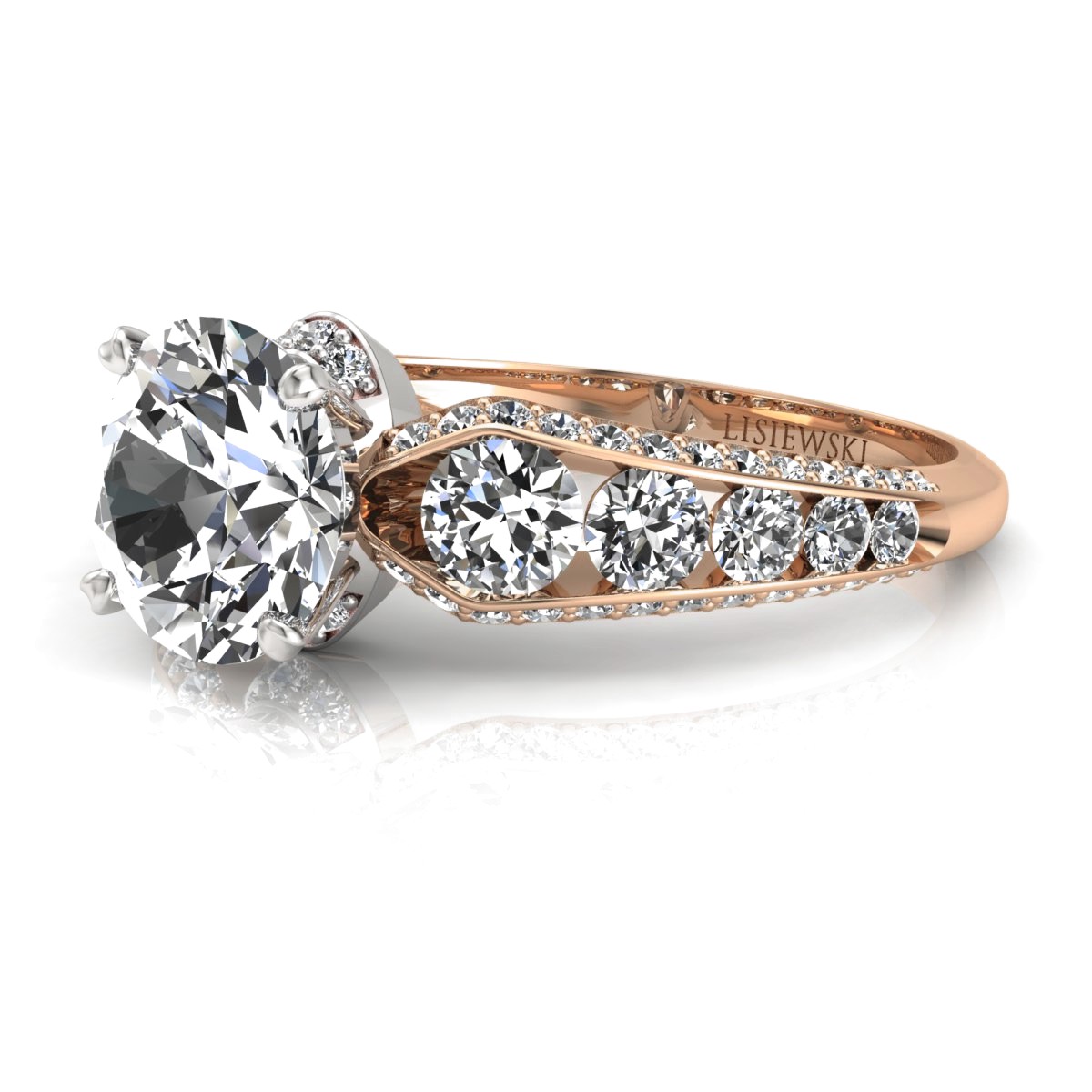Ten pierścionek będzie odpowiednim podarunkiem dla kobiety, która uwielbia lśnić. Nie dość, że jest w nim mnóstwo diamentów o różnej masie, to dodatkowo został on wykonany z dwukolorowego złota. Dominuje w nim różowe złoto, a białe złoto jest tylko dodatkiem. Kamieniem głównym jest diament o masie 1.79 ct. Po jego obu stronach w szynie pierścionka znalazły się diamenty. Mają one łączną masę aż 0.98 ct. W pierścionku poza wspomnianym kamieniem głównym umieszczono aż 68 diamentów. Charakteryzuje się on ogromną elegancją.