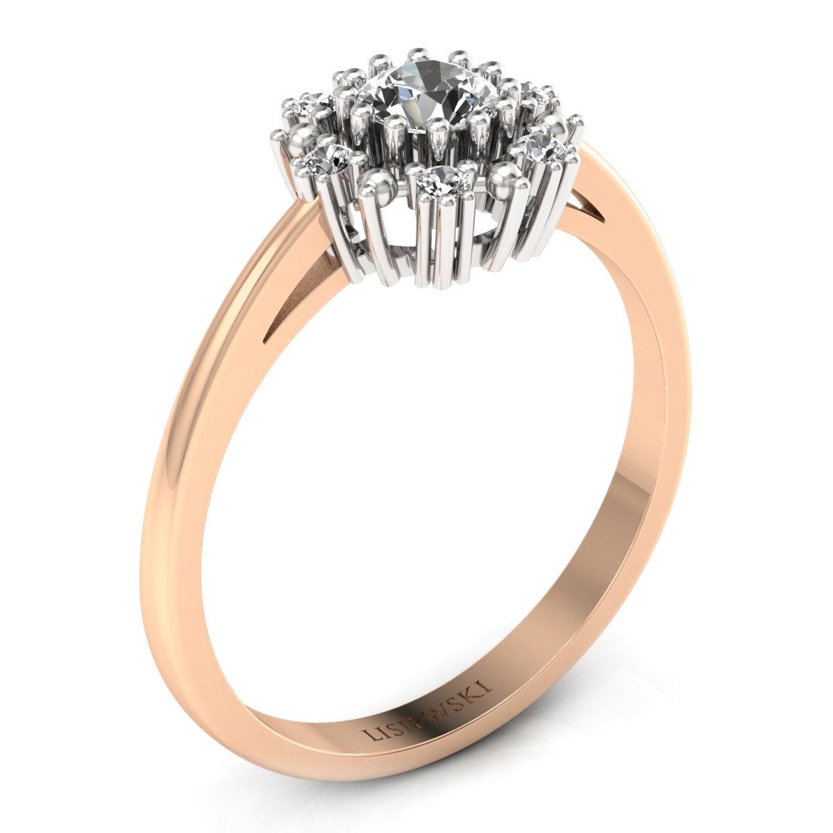 Obok tego pierścionka zaręczynowego po prostu nie da się przejść obojętnie. Zachwyca swoją urodą i bogactwem. Wszystko za sprawą bardzo ciekawego połączenia różowego złota oraz brylantów. Pierścionek zaręczynowy posiada koronę o interesującym kształcie kwiatu. W koronie znalazł się jeden bardzo duży diament o masie 0.24 ct. Otaczają go mniejsze diamenty o łącznej masie 0,06 ct. Łącznie w pierścionku jest osadzonych siedem diamentów. Różowe złoto ma próbę 585. Poza różowym złotem ten pierścionek ma elementy z białego złota.