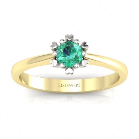 Szmaragd jest bardzo cenionym w jubilerstwie kamieniem szlachetnym. To, co pierwsze rzuca się w oczy to jego wspaniały, jasnozielony kolor. Szmaragd ma masę 0,26 ct oraz okrągły, brylantowy szlif. Tym, co jeszcze wyróżnia ten pierścionek jest wykonanie go z dwóch rodzajów złota. Przeważa w nim żółte złoto. Natomiast z białego złota zostały zrobione tylko niewielkie serduszka zlokalizowane wokół korony pierścionka. Oba rodzaje złota posiadają próbę 585. Pierścionek jest niezwykle elegancki i stylowy.